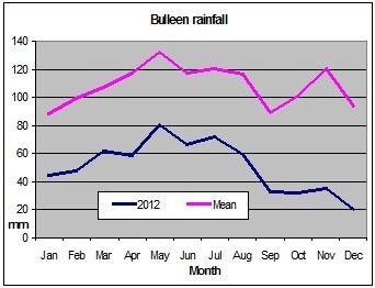 LOW RAINFALL The billabong is now completely empty. It dried out in the second week of December. In fact the whole reserve is very dry now; soils are cracking and new plantings are considerably stressed. The wheelie bins have been put to good use moving Yarra water to the new plantings ![]() Mean and 2012 rainfall graph. Unfortunately the drying out has been parallelled by a healthy seedling growth of spear thistle, ink weed and tiny blackberries. Mechanical slashing is being used to keep down reseeding, but we have to work on full suppression. The massive growth of weeds in the woodland area following good early spring conditions resulted in a massive production of dry (now very dry) matter. The 'entry level' brush cutter is again being overworked to knock this down to reduce fire risk. The last few seasons have been very kind to our blackberry patches. They have been spreading fast and furiously. More so than we had realised. ![]() Blackberries. There are a few overworked sprayers trying hard to pull them back into line. |