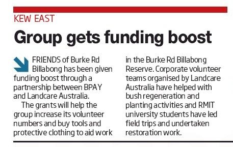 We received funding from BPay View (reported in the Boroondara Leader of 12 March) for tools and protective clothing, and have so far purchased a new and more powerful brush-cutter and 'dutch hoes'. The brush cutter with 'chain-saw' blade has been put to good use already, removing woody weeds north of the billabong. We have also received advice that another grant has been approved, this for a slasher. COMMUNITY WORK DAYS On work days we have continued with weeding and have started planting again now the weather is cooler and some rain has come again. Work has also continued on the Trad with spraying making a noticeable difference beside the path. FRIDAY 12 APRIL 2013 9 a.m. to 1 p.m. & SUNDAY 28 APRIL 2013 10 a.m. to 1 p.m. Burke Rd. Billabong Committee of Management. www.vicnet.net.au/~fobrb |